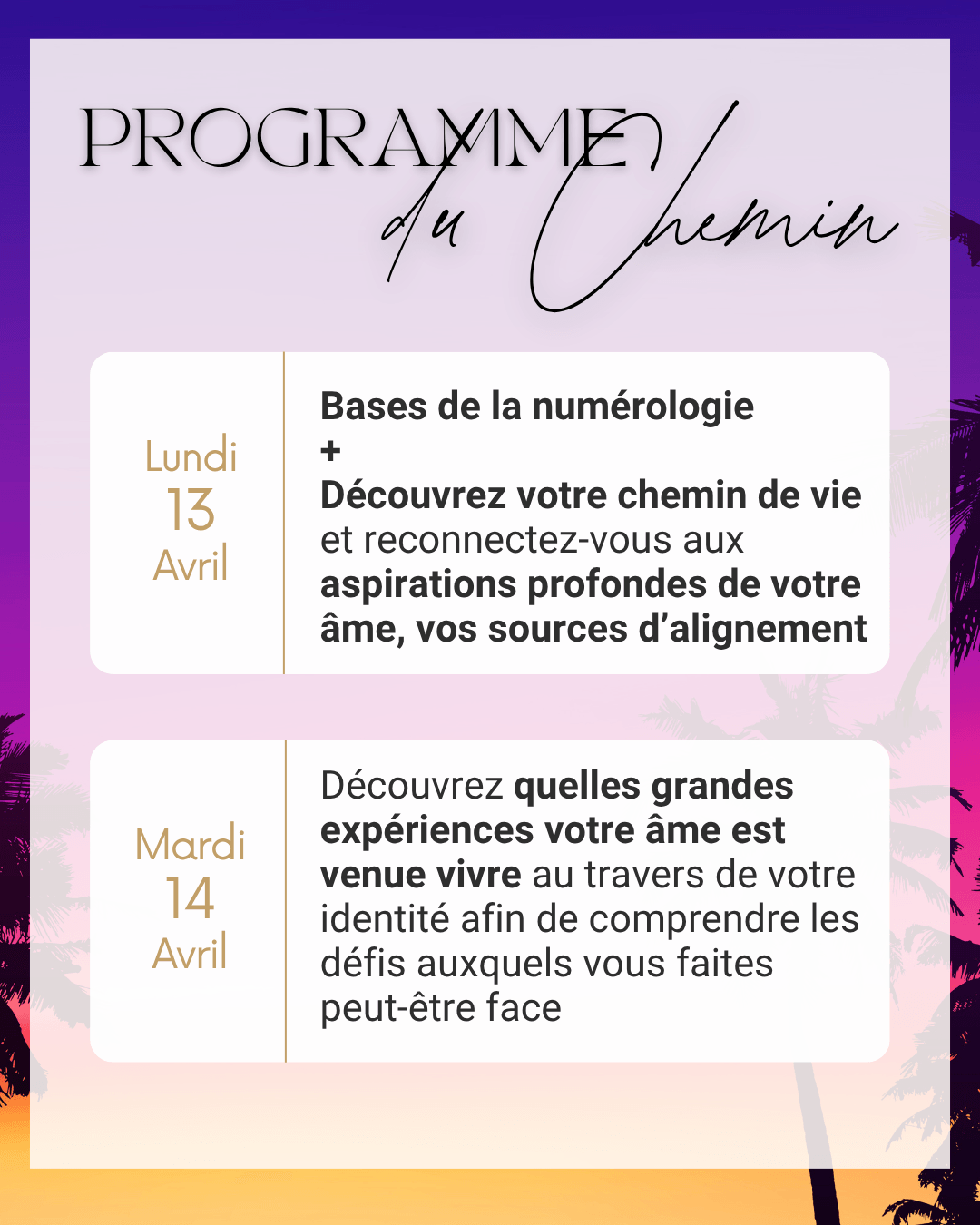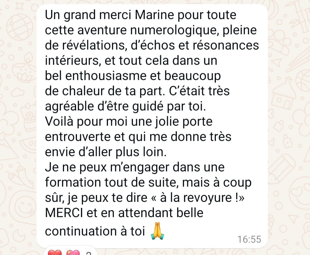En fin d’expérience, je proposerai à celles et ceux qui le souhaitent de poursuivre l’aventure à travers ma formation complète à la numérologie, sans obligation. Dans le respect total de ton rythme et de ton appel intérieur.