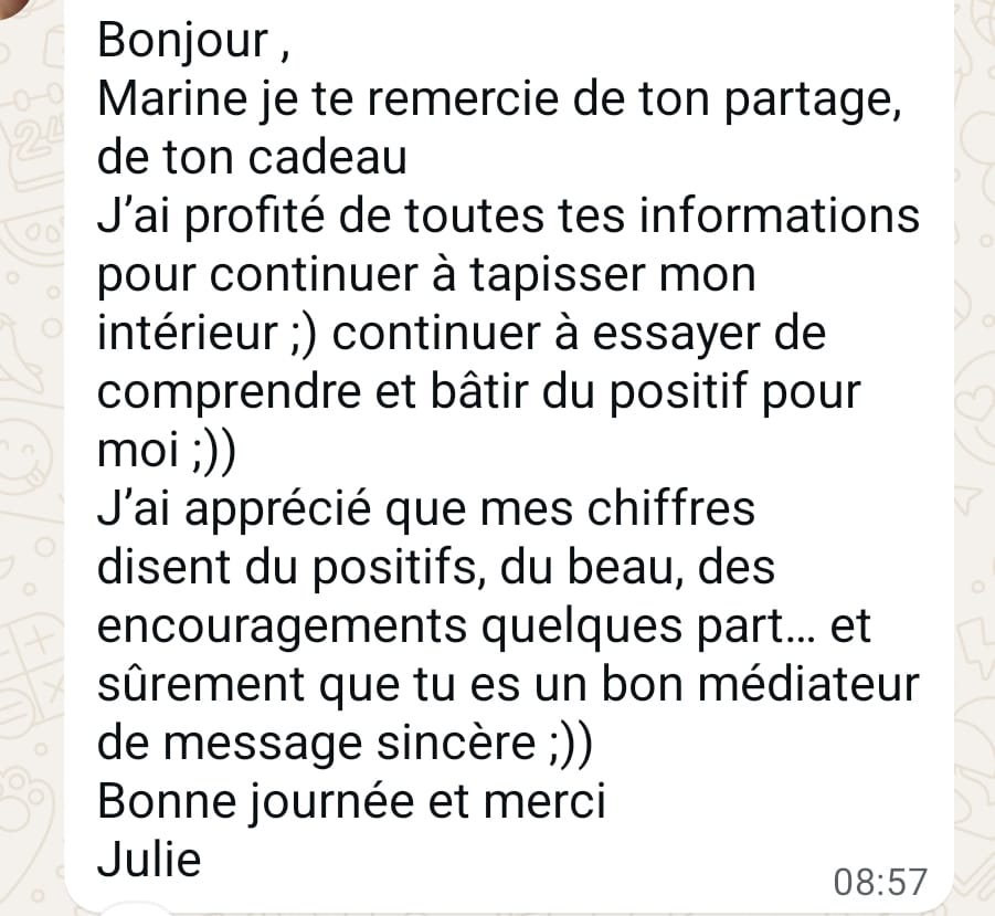 👉 Je te transmets un élément précis de TA matrice, et tu pourras même en profiter pour découvrir la matrice de tes proches afin de peut-être les guider aussi (tes enfants, ton conjoint, tes amis, tes parents)