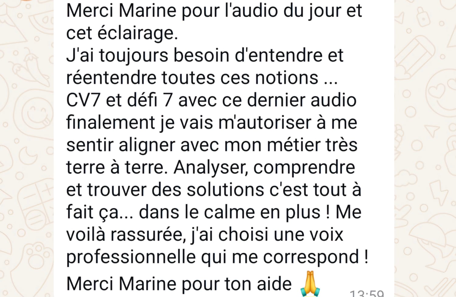 Tu seras libre d'écouter ces audios au meilleur moment pour toi 😁 (pendant un trajet en voiture, dans les transports en allant au boulot, pendant votre séance de sport...) c'est un format ultra libre et léger, tout en étant très puissant !