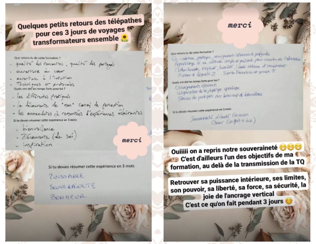 En fin d’expérience, je proposerai à celles et ceux qui le souhaitent de poursuivre l’aventure à travers ma formation complète en Télépathie Quantique®.